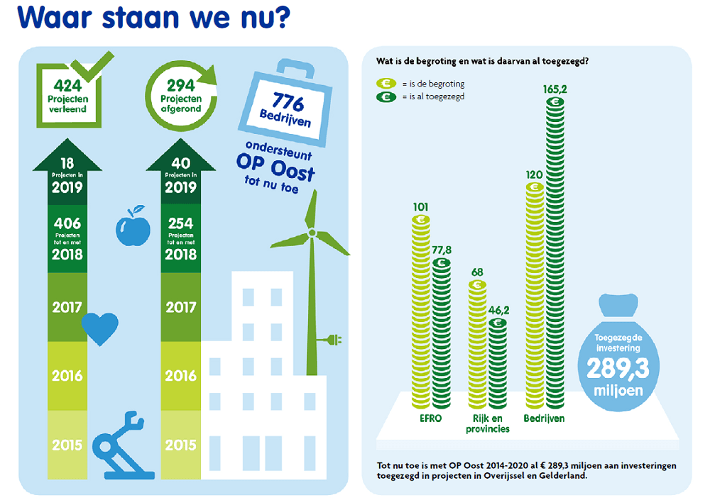 Het vijfde jaarverslag laat zien dat inmiddels 776 bedrijven gebruik maken van het OP Oost subsidieprogramma. De betrokken ondernemers werken samen en met kennisinstellingen en andere maatschappelijke organisaties aan 424 slimme en duurzame projecten. Van de beschikbare € 169 miljoen aan subsidie is eind 2019 al € 129 miljoen toegekend. Met de eigen bijdrage van ondernemers en (kennis)organisaties betekent dit dat al ruim € 289,3 miljoen aan investeringen toegezegd in Overijssel en Gelderland.